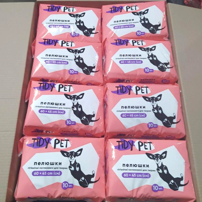 The "Tidy Pet" diaper, which we produce to order from the brand, is available in two sizes: 60*60 and 60*45 cm. The diaper fits perfectly into the tray, absorbs liquid well and removes unpleasant odors. Pets' paws will always be clean.